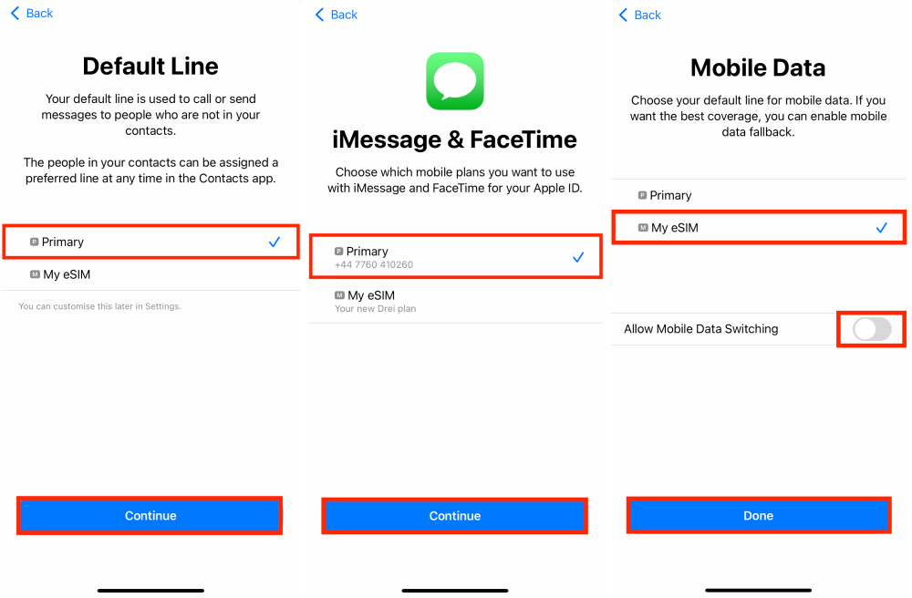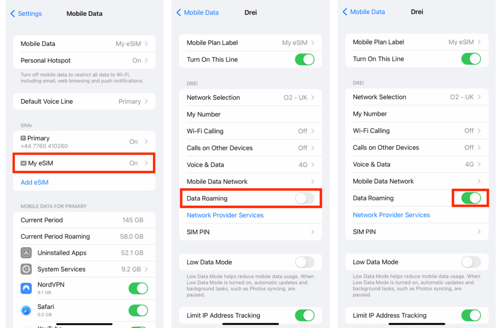 Belangrijk: dataroaming MOET INGESCHAKELD zijn om de eSIM te laten werken! Uw iPhone activeert het plan mogelijk onmiddellijk. Om te voorkomen dat u vóór uw reis data gebruikt, schakelt u roaming uit op al uw mobiele data-abonnementen en schakelt u deze in wanneer u op uw bestemming bent aangekomen.